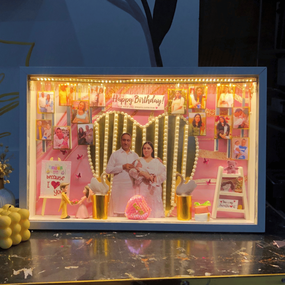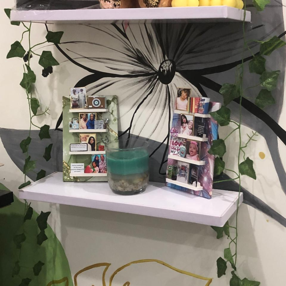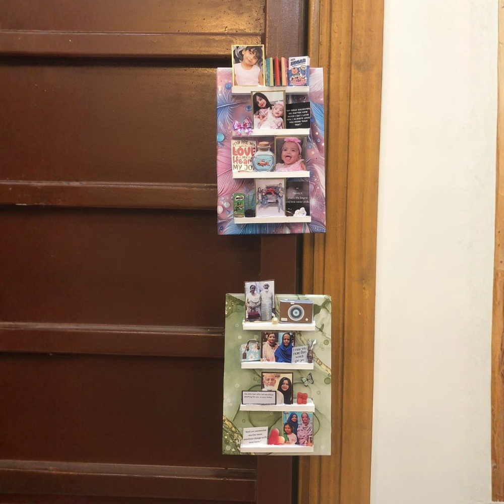 its mdf based magnet with 4 shelves to increase pictures and moments with minaitures and some quotes that will remain in the house with protected and laminated images .