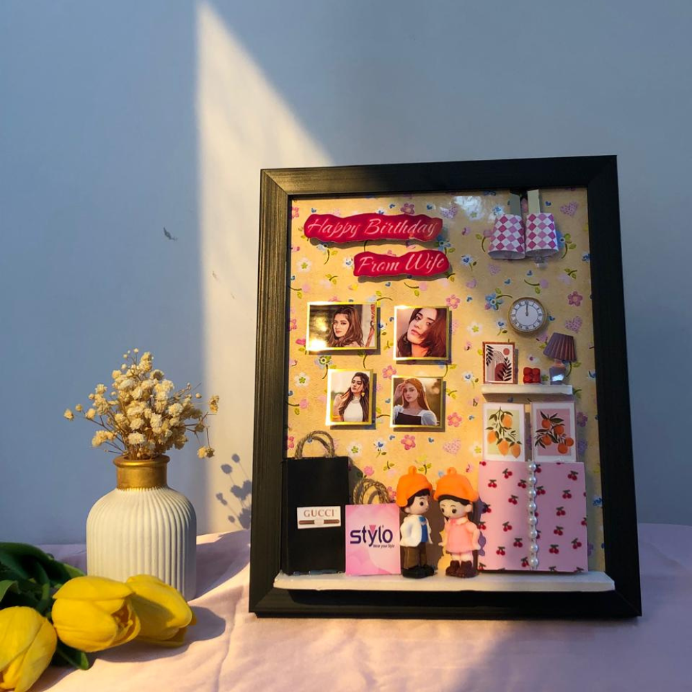 This stunning Handcrafted Lamp Frame features a unique shadow box design made from durable MDF base and beautifully arranged miniature displays. It includes two functional lamps that softly illuminate your personalized setup, bringing warmth and depth to every detail. A one-of-a-kind, fully customizable keepsake gift โ perfect for capturing cherished memories in a luminous way.