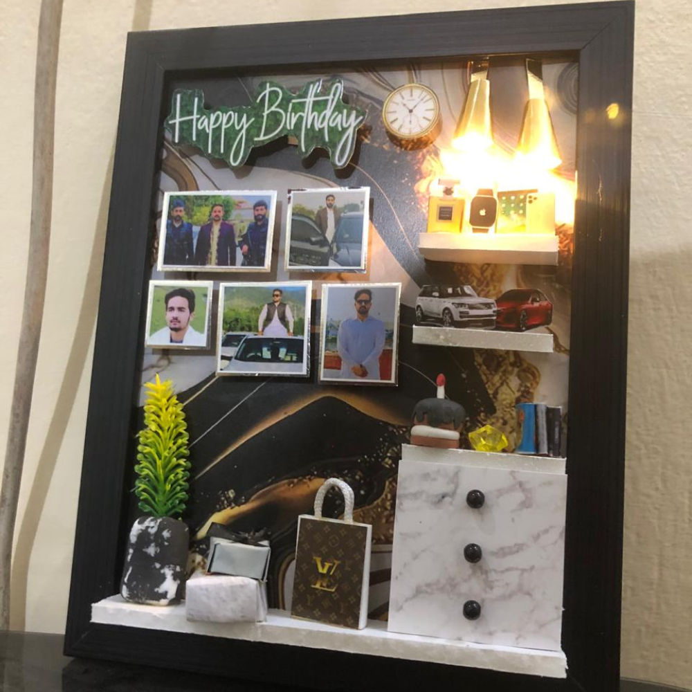 This stunning Handcrafted Lamp Frame features a unique shadow box design made from durable MDF base and beautifully arranged miniature displays. It includes two functional lamps that softly illuminate your personalized setup, bringing warmth and depth to every detail. A one-of-a-kind, fully customizable keepsake gift โ€” perfect for capturing cherished memories in a luminous way.
