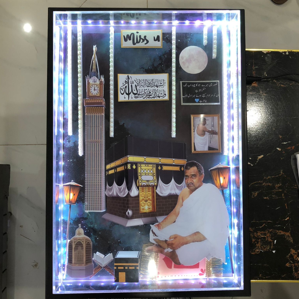 This stunning Handcrafted Lamp Frame features a unique shadow box design made from durable MDF base and beautifully arranged miniature displays. It includes two functional lamps that softly illuminate your personalized setup, bringing warmth and depth to every detail. A one-of-a-kind, fully customizable keepsake gift โ€” perfect for capturing cherished memories in a luminous way.
