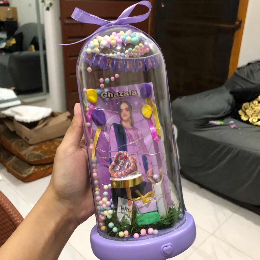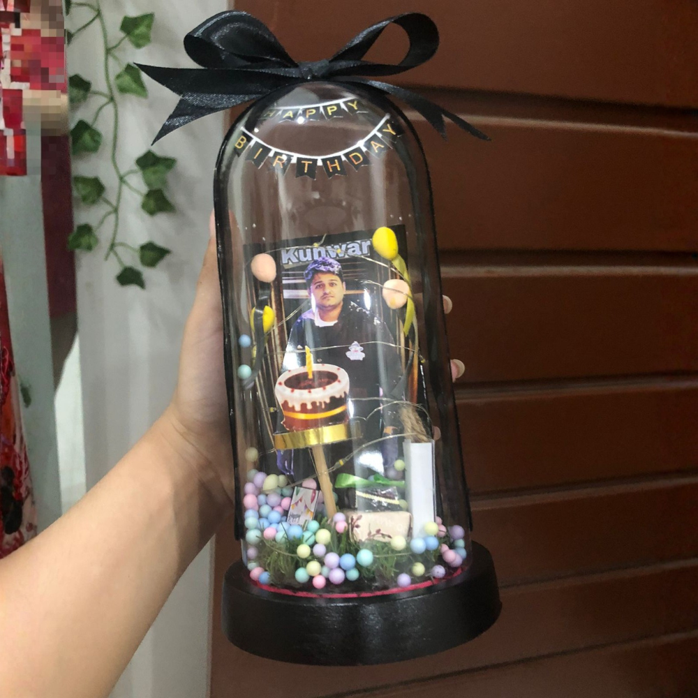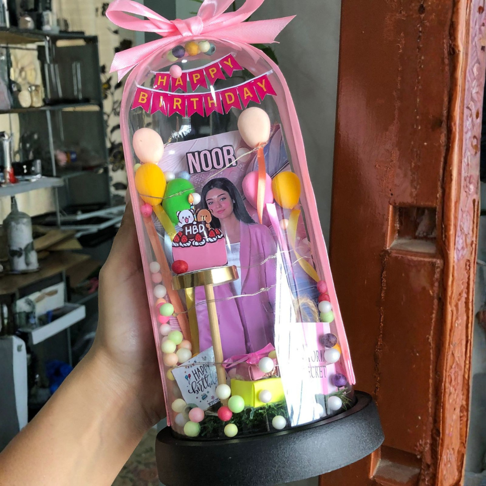 Each globe features your chosen photo, surrounded by delicate string lights that give it a magical, radiant look. Resting on a colored base with an elegant bow, it’s both simple and beautiful — perfect for gifting or decorating a birthday setup.
