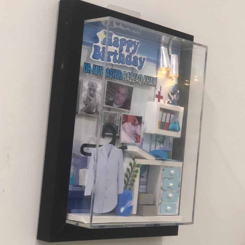 This stunning Handcrafted Lamp Frame features a unique shadow box design made from durable MDF base and beautifully arranged miniature displays. It includes two functional lamps that softly illuminate your personalized setup, bringing warmth and depth to every detail. A one-of-a-kind, fully customizable keepsake gift โ€” perfect for capturing cherished memories in a luminous way.