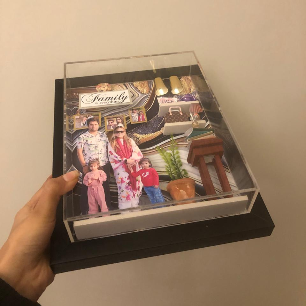This stunning Handcrafted Lamp Frame features a unique shadow box design made from durable MDF base and beautifully arranged miniature displays. It includes two functional lamps that softly illuminate your personalized setup, bringing warmth and depth to every detail. A one-of-a-kind, fully customizable keepsake gift โ perfect for capturing cherished memories in a luminous way.