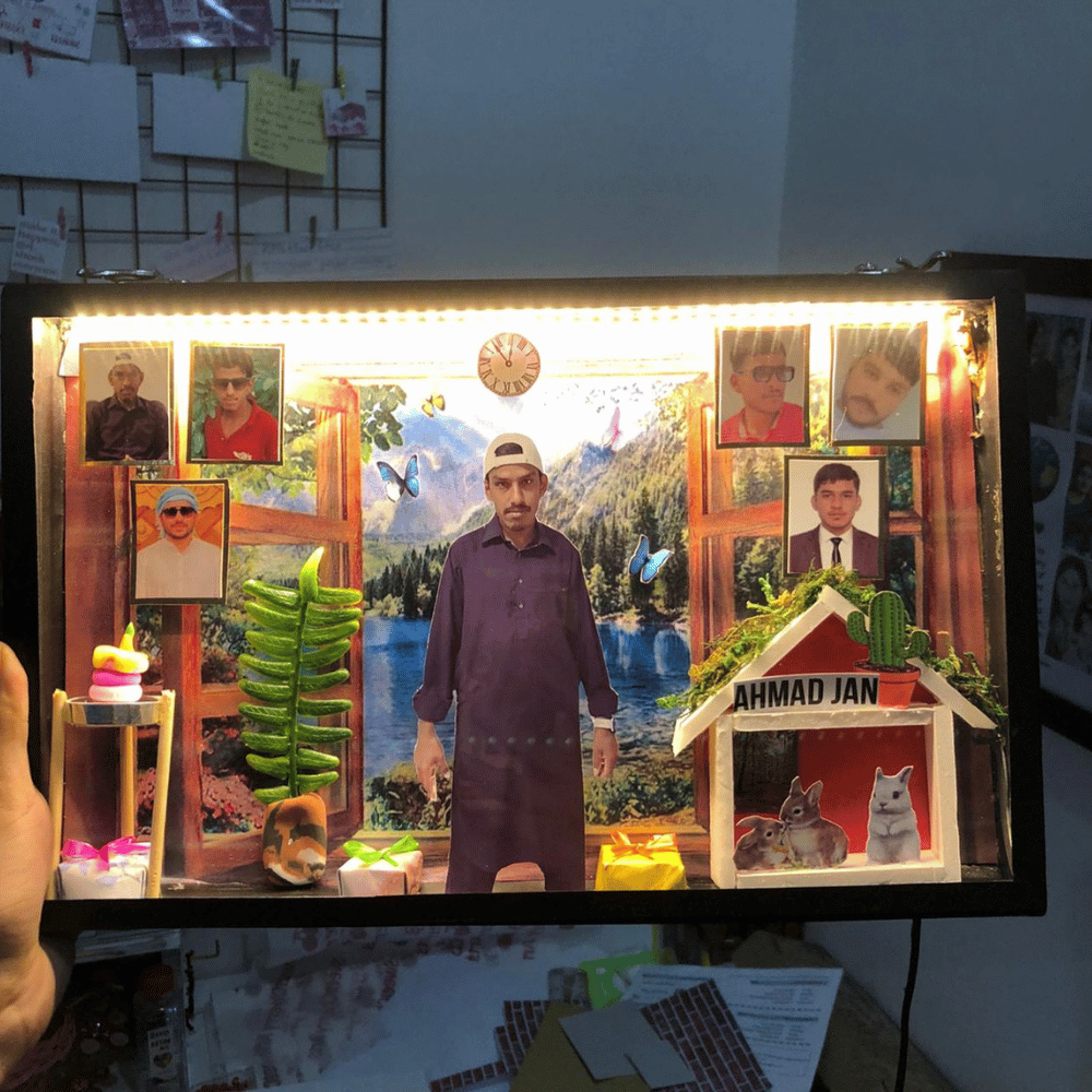 Crafted from hard paperboard, this elegant keepsake features a fully covered exterior with a hanging option on top. The interior includes one printed picture complemented by five 3D handmade miniature objects representing the recipient’s favourite things.
