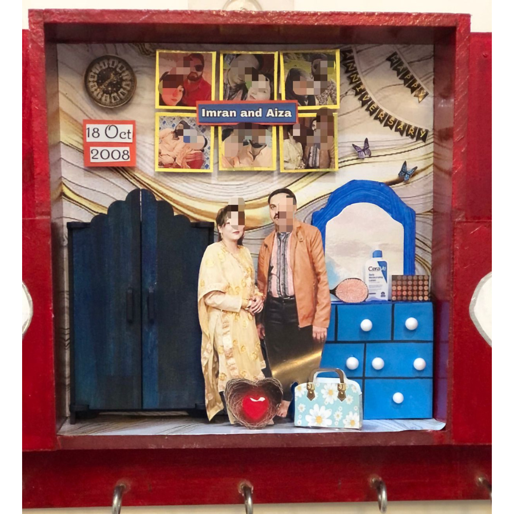 Handcrafted miniature couple-themed key holder designed as a beautiful wall organizer and memory display. Fully customizable with your chosen theme, 5–7 photos, and personalized text. Includes sturdy hooks for keys, glasses, mobile, pens, and more. A perfect blend of décor and utility. Price: 3800 with free delivery.