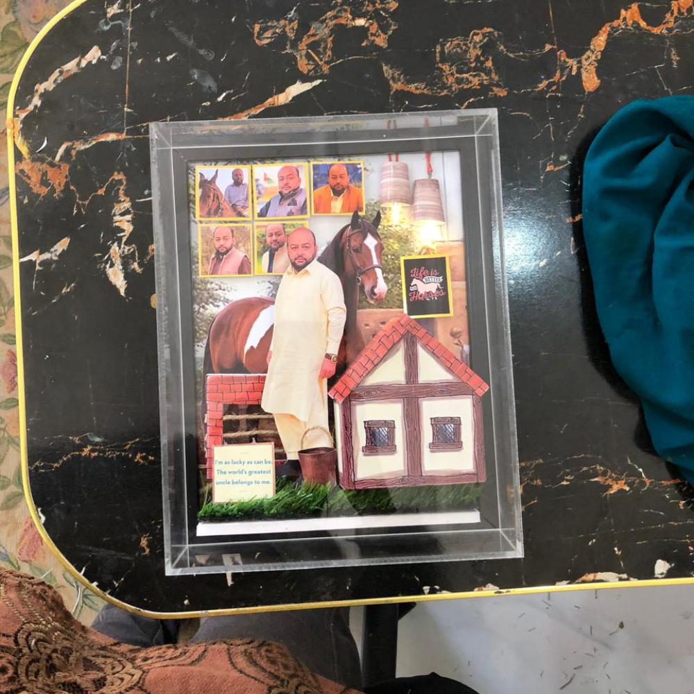 This stunning Handcrafted Lamp Frame features a unique shadow box design made from durable MDF base and beautifully arranged miniature displays. It includes two functional lamps that softly illuminate your personalized setup, bringing warmth and depth to every detail. A one-of-a-kind, fully customizable keepsake gift โ perfect for capturing cherished memories in a luminous way.